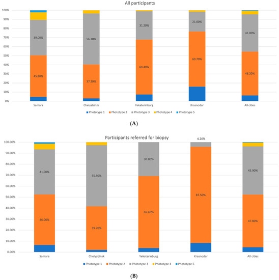Distribution of the participants by skin phototype in the studied regions. (A) All participants. (B) Participants with suspected melanoma or other skin cancers.