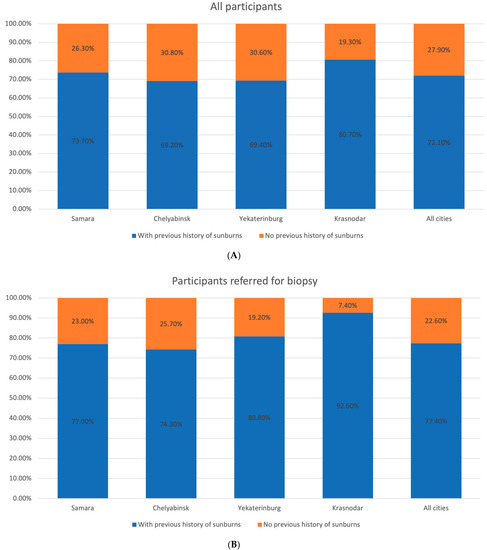 Distribution of the participants by previous sunburns in the studied regions. (A) All participants. (B) Participants with suspected melanoma or other skin cancers.