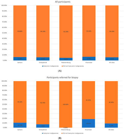 Distribution of the participants by the cancer in their personal history in the studied regions. (A) All participants. (B) Participants with suspected melanoma or other skin cancers.