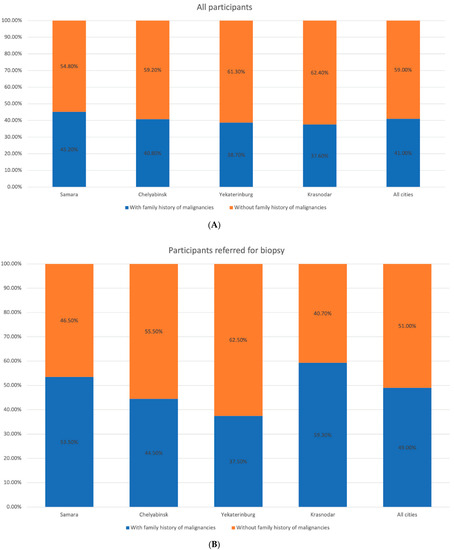 Distribution of the participants by the malignancies in the family history in the studied regions. (A) All participants. (B) Participants with suspected melanoma or other skin cancers.