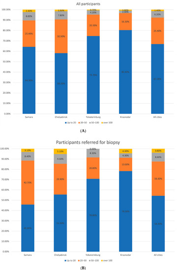 The only inclusion criterion for the program participants was age limit—adults over 18. The cities of Samara, Chelyabinsk, Yekaterinburg, and Krasnodar, whose residents were involved in the Program, were chosen based on the CM incidence rate, population >1 million, and regional healthcare support. The LFF program enrolled 3143 participants. The number of female participants was significantly higher than male participants, including 2369 women (75.4%) and 774 men (24.6%). Such a proportion was almost the same in all studied regions. The average age accounted for 43.7 (95% confidence interval (CI): 43.2–44.3) years. However, the age difference was registered as following: the average age of 44.7 (95% CI: 43.6–45.7) and 45.1 (95% CI: 44.2–45.9) in Samara and Chelyabinsk, respectively, was higher than that of Yekaterinburg, and Krasnodar, 41.6 (95% CI: 40.4–42.8) and 42.1 (95% CI: 40.6–43.6), respectively.