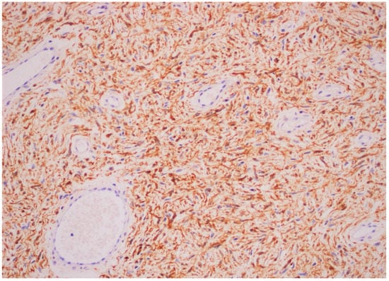 The histopathological analysis of neurofibromas reveals a mixture of cell types including Schwann cells, perineurial cells, and fibroblasts. Schwann cells account for 40–80% of the cells and present with widened nuclei, undulated shape, and sharp corners [2,13]. Immunochemistry is fundamental to demonstrate the presence of neural involvement in these tumors through specific immunoreactions including S100, type IV collagen, CD34, and neurofilament or neuron specific tubulin TUBB3 [3].
