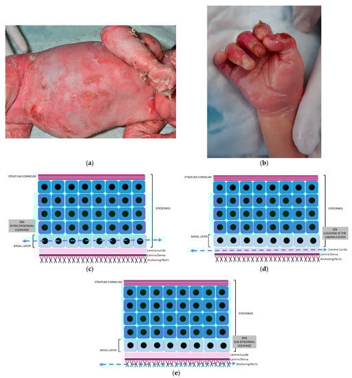 - Fine, J.-D.; Bruckner-Tuderman, L.; Eady, R.A.; Bauer, E.A.; Bauer, J.W.; Has, C.; Heagerty, A.; Hintner, H.; Hovnanian, A.; Jonkman, M.F.; et al. Inherited epidermolysis bullosa: Updated recommendations on diagnosis and classification. J. Am. Acad. Dermatol. 2014, 70, 1103–1126. [Google Scholar] [CrossRef] [PubMed]