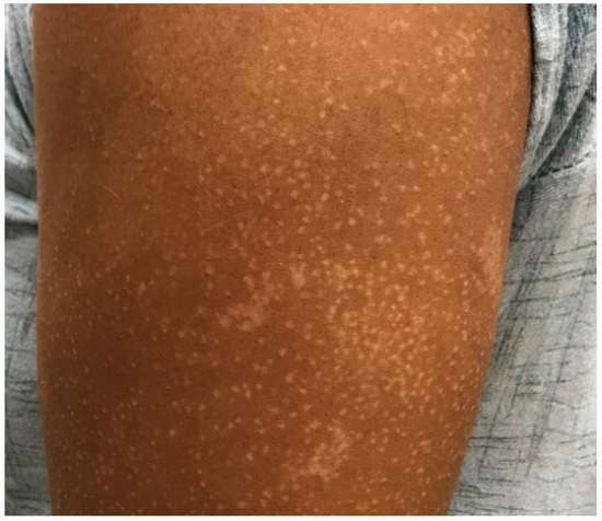There are numerous subtypes of MF with different clinical presentations adding to the diagnostic challenge. These subtypes include pagetoid reticulosis, folliculotropic, poikilodermatous, bullous, granulomatous, and hypopigmented [8]. Hypopigmented MF is a rare variant that is more likely than other types of cutaneous T-cell lymphoma to affect young patients and patients of African American or Hispanic descent [9,10]. A recent study of Chinese patients found that the age of patients with hypopigmented MF was significantly younger than for other variants with a median of 13.4 years and these patients had a good response to treatment [11]. Clinically, patients present with patches or plaques in sun-protected areas, as in other types of MF, but the lesions have lighter coloration than the surrounding skin (see Figure 2). There may also be a mixed presentation with the presence of both hypopigmented and erythematous lesions [11]. The clinical differential diagnosis is broad and includes vitiligo, pityriasis alba, post-inflammatory hypopigmentation, and leprosy [8]. Biopsy and histopathologic analysis are imperative in making the diagnosis.