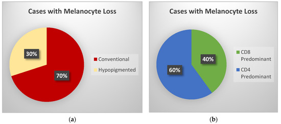 Ten cases displayed melanocyte loss by SOX10 IHC. The loss was observed in both conventional and hypopigmented cases (a) and in CD8 or CD4 predominant cases (b).