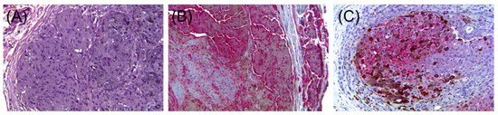 Malignant melanoma ((A), H & E ×20). Lesional cells are positive for S100 ((B), immunohistochemical stain ×20) and low molecular weight keratin ((C), immunohistochemical stain ×20).