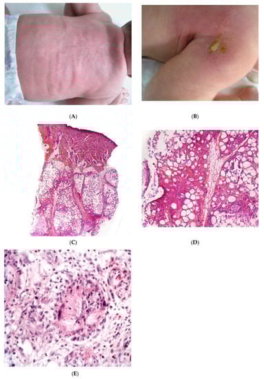 SFN is a rare variant of lobular panniculitis that appears in term or post-term newborns during the first days of life. The lesions are characterised clinically by indurated plaques and subcutaneous nodules that are primarily located on the buttocks, shoulders, cheeks, and thighs (Figure 1A). In some cases, the nodules and plaques can ulcerate and exude purulent material [6,7,8] (Figure 1B). The cause of SFN is unknown, although many cases are associated with perinatal asphyxia and meconium aspiration. The pathogenesis of SFN might be related to a greater saturated/unsaturated fatty acid ratio in the newborn, since saturated fatty acids have a greater tendency to crystallise in adipose tissue. SFN has an excellent prognosis, and spontaneous resolution within several weeks is common. However, delayed-onset hypercalcemia may occur, and so prolonged calcium monitoring is advisable. A biopsy is not always necessary because the clinical diagnosis is often straightforward. However, a biopsy can be useful in clinically misleading cases (such as multinodular cases, in particular) because the histological findings are specific.