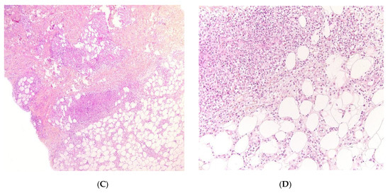 Early-onset panniculitis with systemic inflammation had been reported in cases of autoinflammatory diseases with or without an associated immunodeficiency [13,14]. Most cases have variable, non-specific histopathologic features: lobular or septal panniculitis with a mixture of cells or with a predominance of neutrophils or lymphocytes (Figure 3 and Figure 4). However, the histopathologic features can sometimes have diagnostic value, such as the granulomatous infiltrate characteristic of Blau syndrome (BS) or the polyarteritis-nodosa-like vasculitis in deficiency of adenosine deaminase 2 (DADA2). The presence of early-onset panniculitis with systemic inflammation should prompt the physician to screen for autoinflammatory disorders.