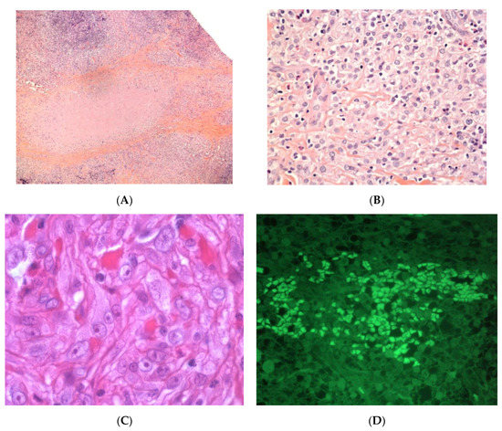 The aspect is similar to that of EN in adults, with mostly septal panniculitis. The septa of the subcutaneous fat are thickened, and an inflammatory cell infiltrate is present (Figure 7B,C) Neutrophils predominate in acute lesions, whereas mononuclear cells and histiocytes predominate in chronic lesions. Miescher’s radial granuloma—an aggregation of histiocytes around a central stellate or “banana-shaped” cleft—is specific for EN but is not always present (Figure 7D).