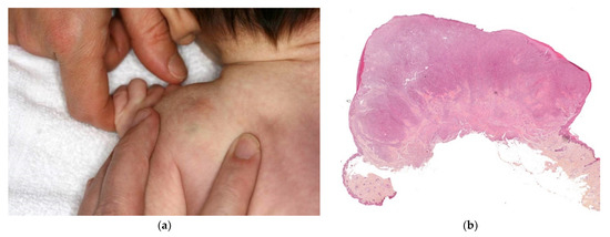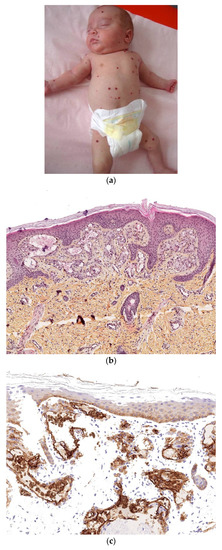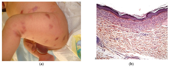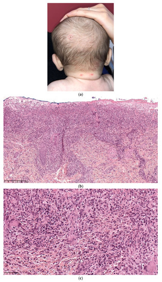 Congenital Langerhans cell histiocytosis (LCH) is rare and, in most cases, regresses spontaneously very quickly, within a few weeks of birth. This self-resolving form of histiocytosis was first described by Hashimoto and Pritzker in 1973. Typically, skin lesions manifest as widespread vesicles, pustules, or both. They are often erosive and purpuric and can be mistaken for neonatal herpes. Purplish, reddish-brown, crusted, papulonodular lesions with central necrosis and ulceration are observed in 25–30% of cases of neonatal LCH (Figure 7a,b). A few nodules may develop [11,12]. Furthermore, some babies with congenital LCH may develop a “blueberry muffin rash” [13].