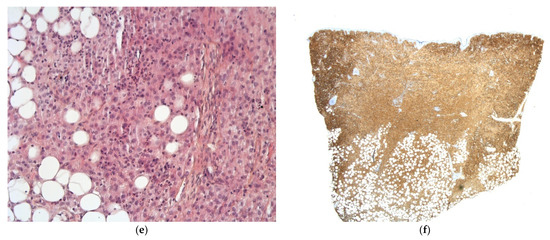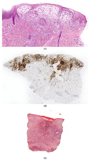 A skin biopsy is always necessary to confirm the diagnosis of LCH. Cutaneous LCH is characterized by an infiltration of the papillary dermis by monomorphous, medium-sized histiocytes with a pink, non-xanthomized cytoplasm and a kidney-shaped, grooved, or folded nucleus. These cells are positive for CD1a and CD207 (Langerin); the latter is specific for Birbeck granules. These cells may be associated with eosinophils, lymphocytes, and/or red blood cells. Epidermotropism results in a spongiform pattern with focal parakeratosis. It is not possible to differentiate between regressing LCH and non-regressing LCH on the sole basis of the histological data. The nodular form of LCH shows a tumoral intradermal infiltration of large histiocytes and commonly ulcerated overlying epidermis. The cells comprise Langerhans cells (CD1a+, CD207+), indeterminate cells (CD1a+, CD207− (Figure 7c–e), and macrophages (CD163+, CD1a−, CD207−) [14]. Most cases harbor mutations in the MAP kinase pathway and especially in the BRAF gene.