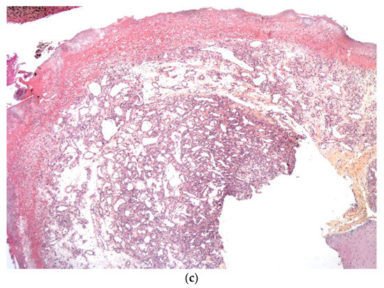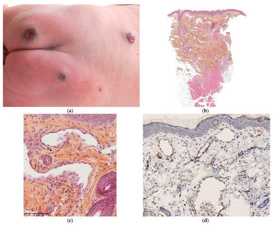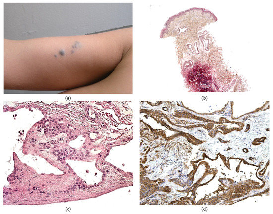 A histologic assessment of MLT will reveal dilated, thin-walled vascular channels and variable endothelial hyperplasia in the dermis and subcutis. Most lesions display intraluminal papillary projections [32,33] (Figure 13b,c). The endothelial nuclei are prominent and sometimes hobnailed. MLT is often positive for the lymphatic marker Lyve-1 but may be negative for podoplanin (using the D2-40 antibody) (Figure 13d).