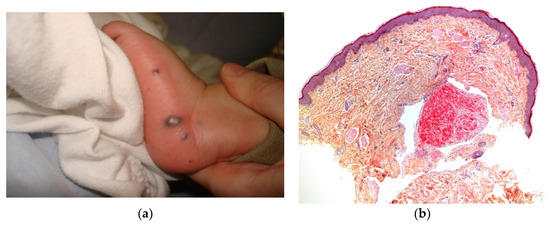 - Prasad, V.; Fishman, S.J.; Mulliken, J.B.; Fox, V.L.; Liang, M.G.; Klement, G.; Kieran, M.W.; Burrows, P.E.; Waltz, D.A.; Powell, J.; et al. Cutaneovisceral angiomatosis with thrombocytopenia. Pediatr. Dev. Pathol. 2005, 8, 407–419. [Google Scholar] [CrossRef]