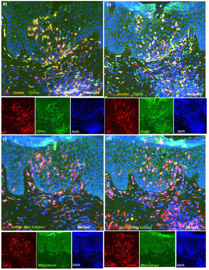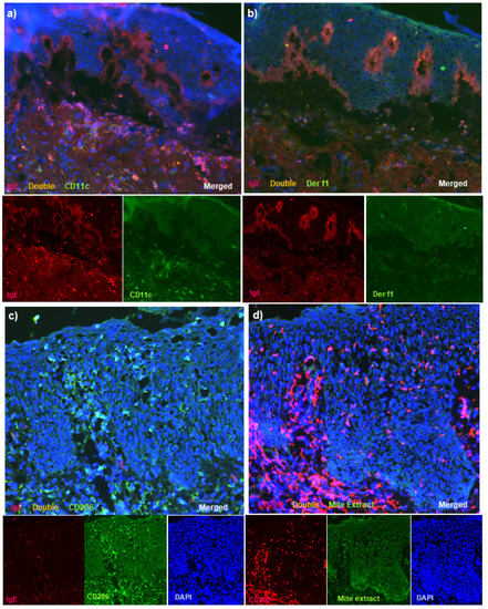 In the control cases with non-eczematous inflammatory skin disorders and serum hyper-IgE, infiltration of only a small number of double-positive IgE+ CD11c+ cells and IgE+ CD206+ cells in the epidermis (i.e., IgE-bearing IDECs) and double-positive IgE+ CD11c+ cells in the upper dermis (i.e., IgE-bearing dermal inflammatory DCs) was seen. Furthermore, infiltrating double-positive cells with HDM antigens (i.e., Der f1 antigens and Mite Extract antigens) were scarcely found in the epidermis by double-immunofluorescence staining for IgE and Der f1, IgE and Mite Extract antigens, CD206 and Der f1, and CD206 and Mite Extract antigens; in addition, they were rarely found in the upper dermis by the staining for IgE and Der f1 (Figure 3a,b: case 11). In the control cases with inflammatory skin disorders and spongiotic tissue within the epidermis, infiltrating double-positive cells with HDM antigens were scarcely found in the spongiotic epidermis by double-immunofluorescence staining for IgE and Der f1, IgE and Mite Extract antigens, CD206 and Der f1, and CD206 and Mite Extract antigens (Figure 3c,d: case 13).