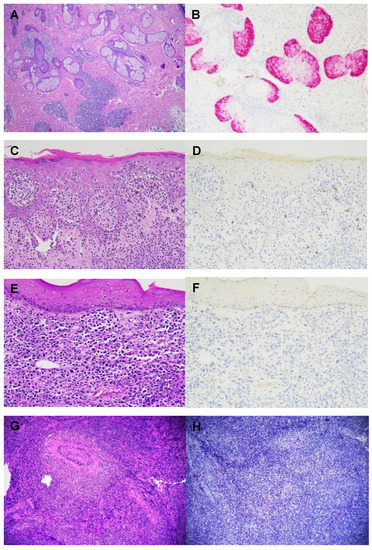 - Willemze, R.; Cerroni, L.; Kempf, W.; Berti, E.; Facchetti, F.; Swerdlow, S.H.; Jaffe, E.S. The 2018 update of the WHO-EORTC classification for primary cutaneous lymphomas. Blood 2019, 133, 1703–1714, Correction in Blood 2019, 134, 1112. [Google Scholar] [CrossRef]