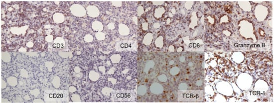 - Magro, C.M.; Wang, X. Indolent primary cutaneous gamma/delta T-cell lymphoma localized to the subcutaneous panniculus and its association with atypical lymphocytic lobular panniculitis. Am. J. Clin. Pathol. 2012, 138, 50–56. [Google Scholar] [CrossRef] [PubMed] [Green Version]