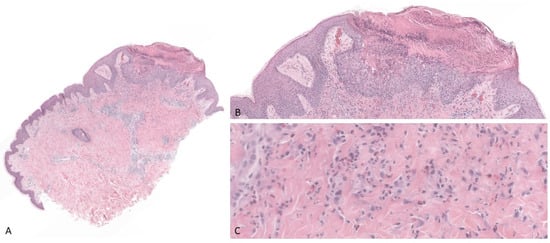 (A,B) Histology showing an erosion covered by a crust containing neutrophils and a dermal inflammatory infiltrate (H&E, original magnification: 1.6× and 6.5×, respectively). (C) Inflammatory infiltrate with neutrophils and numerous eosinophils (H&E, original magnification: 26×).
