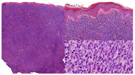 Skin biopsy. (a) Dense diffuse infiltration by neoplastic cells in the dermis and subcutaneous fat (Hematoxylin and Eosin (H&E), 20× original magnification); (b) sparing grenz zone and epidermis (H&E, 200× original magnification); (c) monomorphic agranular medium-sized blast cells (H&E, 1000× original magnification).
