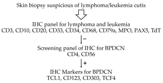 - Liao, C.; Hu, N.X.; Song, H.; Zhang, J.Y.; Shen, D.Y.; Xu, X.J.; Tang, Y.M. Pediatric blastic plasmacytoid dendritic cell neoplasm: Report of four cases and review of literature. Int. J. Hematol. 2021, 113, 751–759. [Google Scholar] [CrossRef] [PubMed]