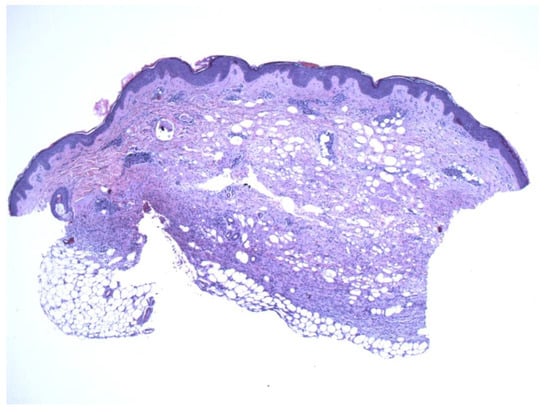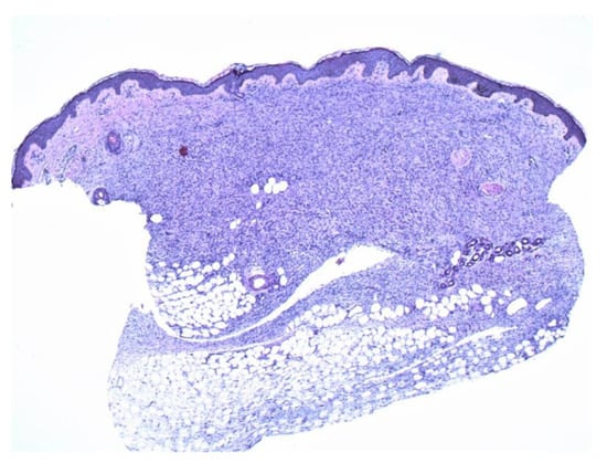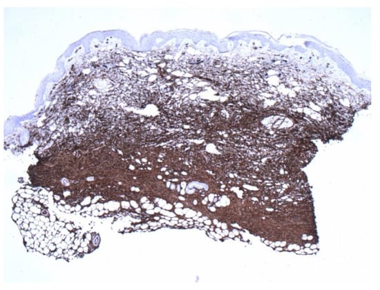 - Hirashima, N.; Misago, N.; Shinogi, T.; Inoue, T.; Miura, Y.; Narisawa, Y. Atrophic dermatofibrosarcoma protuberans with diffuse eosinophilic infiltrate. J. Dermatol. 2006, 33, 486–488. [Google Scholar] [CrossRef] [PubMed]