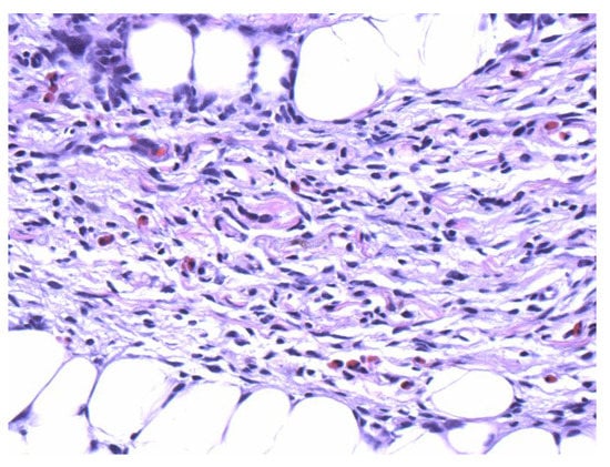 Tissue eosinophilia in this lesion is a highly unusual finding. Eosinophilia is a frequently encountered finding in malignant neoplasms that is considered a favorable host response to malignant tissue []. Eosinophils have an anti-tumorigenic (e.g., TNF-α, granzyme, cationic proteins, and IL-18) and protumorigenic role in different cancers, depending on the location. In melanoma and some gastrointestinal cancers, eosinophils play an anti-tumorigenic role, while in Hodgkin’s lymphoma and cervical carcinoma have been linked to poor prognosis. In melanoma, tumor-associated eosinophils express chemokines (CCL5, CXCL9, CXCL10), prompting the recruitment of tumor-reactive CD8 T cells that mediate tumor rejection. Moreover, eosinophils may collaborate with macrophages, mast cells, NK cells, and dendritic cells to induce anti-tumor responses. Eosinophils may also affect local T cell responses, by modulating the balance of Th1 and Th2-related cytokines. Lastly, eosinophils may also serve as antigen-presenting cells (APC).