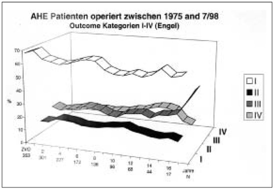 We report the seizure outcome of patients who underwent selective amygdalohippocampectomy (sAHE) performed in Zürich since 1975. Including so-called “lesional cases” the series consists of more than 400 patients. Sufficiently precise followup data were available for 353 patients. The mean follow-up of the patients was 7.5 years (min/max = 1/20.5). The last available seizure outcome was classified according to Engel (1993): I, seizure free; II, rare seizures; III, worthwhile improvement; IV, no worthwhile improvement. Two hundred thirty-seven patients (67%) belonged to outcome category I; 35 patients (10%) belonged to the outcome category II; 56 patients (16%) to outcome category III; and 25 patients (7%) to the outcome category IV. Compared to the follow-up assessed in 1994 [9] (classified = 177; I: 105 [59%]; II: 13 [7%]; III: 20 [11%]; IV: 39 [22%]; non classified: 38 [18%]), the most recent long-term follow-up data are even more favourable. These favourable postoperative seizure outcome data of our patients, in particular the stable year-to-year group data for category I, document the validity of the sAHE procedure developed in Zürich for surgical treatment of drug-resistant mesial temporal lobe epilepsy. Full article