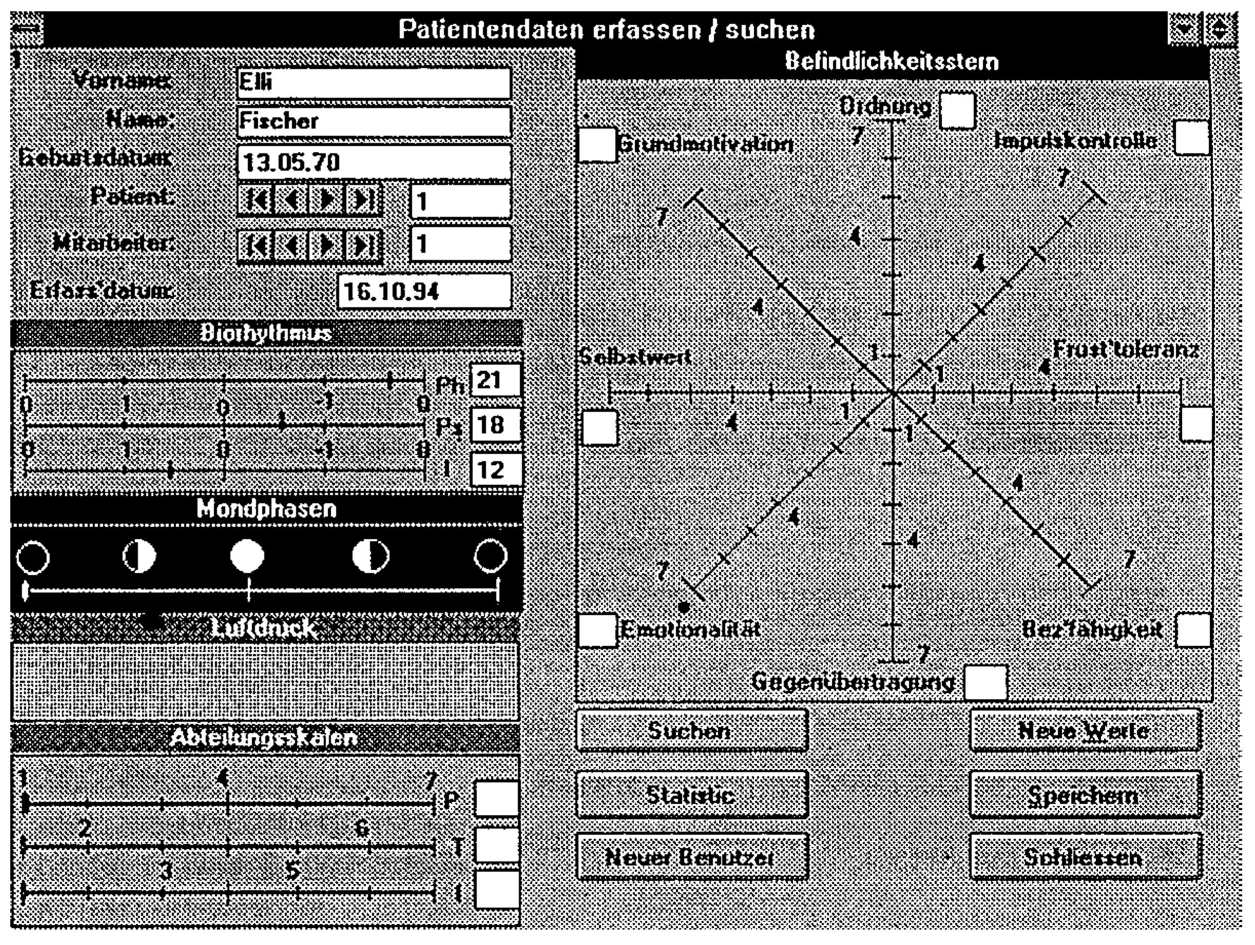 Als zentrales Instrument entwickelten wir den «Befindlichkeitsstern», ein computerisiertes (Wir sind Frau Elena Baitmann und den Dozenten der Ingenieurschule Muttenz sehr zu Dank verpflichtet, die das aufwendige Schreiben eines Computerprogramms nach unseren Wünschen im Rahmen einer Diplomarbeit des Informatik-Nachdiplomstudiums übernommen haben.) Instrument zur Erfassung, Verarbeitung und Visualisierung der kontinuierlichen Patienten-, Selbstund Abteilungsbeurteilungen durch die Mitarbeiter (Das aktuelle PC-Programm sieht vor, dass «weiche» biologische und umweltbedingte Faktoren, die populär mit Schwankungen der Befindlichkeit in Zusammenhang gebracht werden (Mondphase, Wetterfühligkeit, Biorhythmus), mituntersucht werden können. Die Frage der Wetterfühligkeit wird zusammen mit Dr. H. Rychner vom Institut für Atmosphärenphysik der ETH Zürich bearbeitet.).