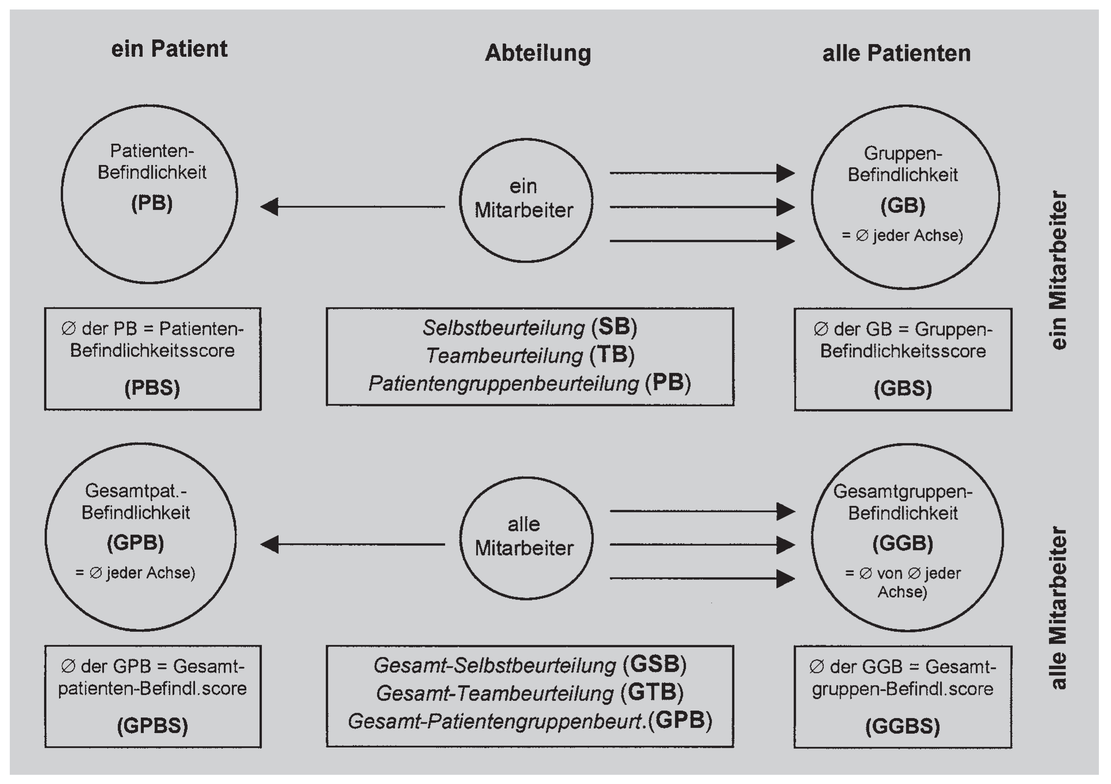 Auf der Ebene eines Mitarbeiters: Aus der Einschätzung eines Patienten durch einen Mitarbeiter (PB = Patientenbefindlichkeit) kann der Durchschnitt der 8 Achsen errechnet werden (PBS = Patientenbefindlichkeitsscore).Aus der Einschätzung aller Patienten durch einen Mitarbeiter (GB = Patientengruppenbefindlichkeit aus der Sicht eines Mitarbeiters) kann der Durchschnitt der Achsen errechnet werden (GES = Gruppeneinschätzungsscore).