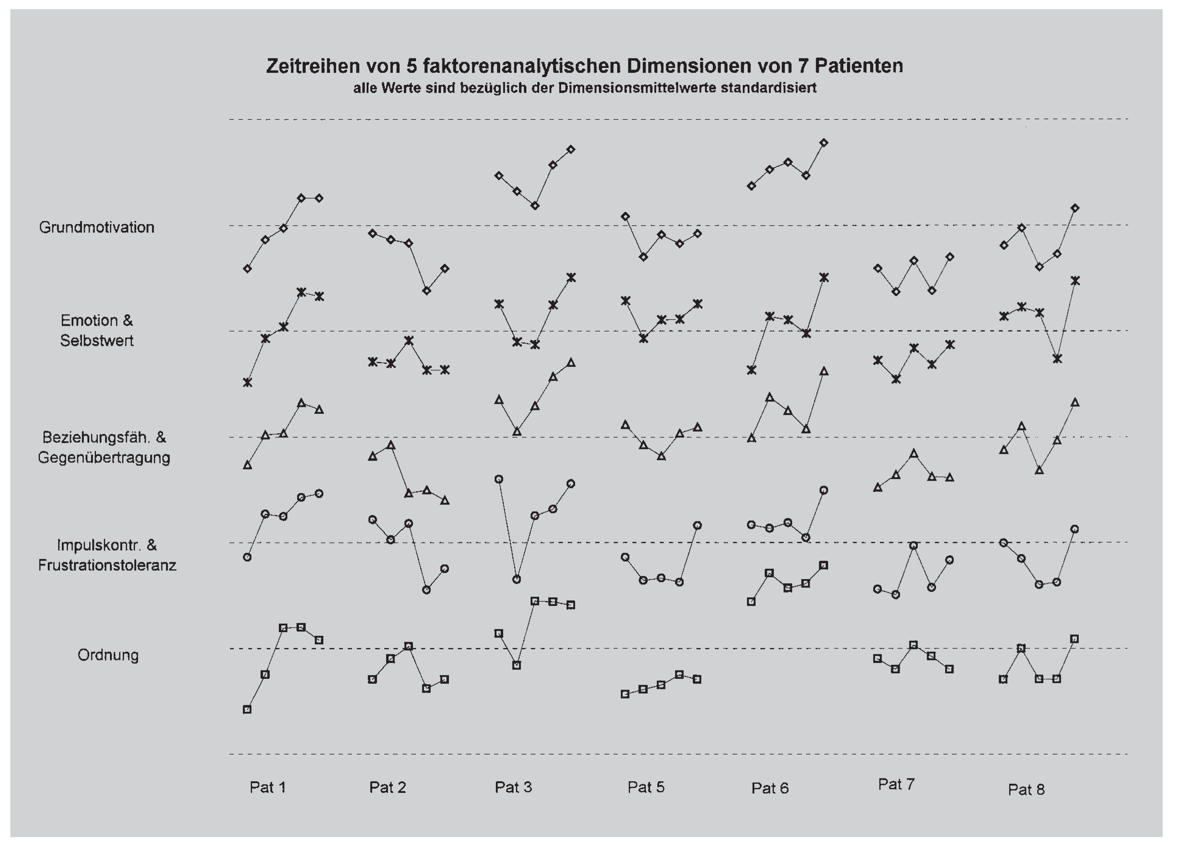 Abbildung 3 dargestellt. Dabei fällt der parallele Verlauf der meisten Dimensionen bei vielen, aber nicht bei allen Patienten auf. Mit nur 5 Zeitpunkten können diese Verläufe jedoch nicht statistisch bearbeitet werden.