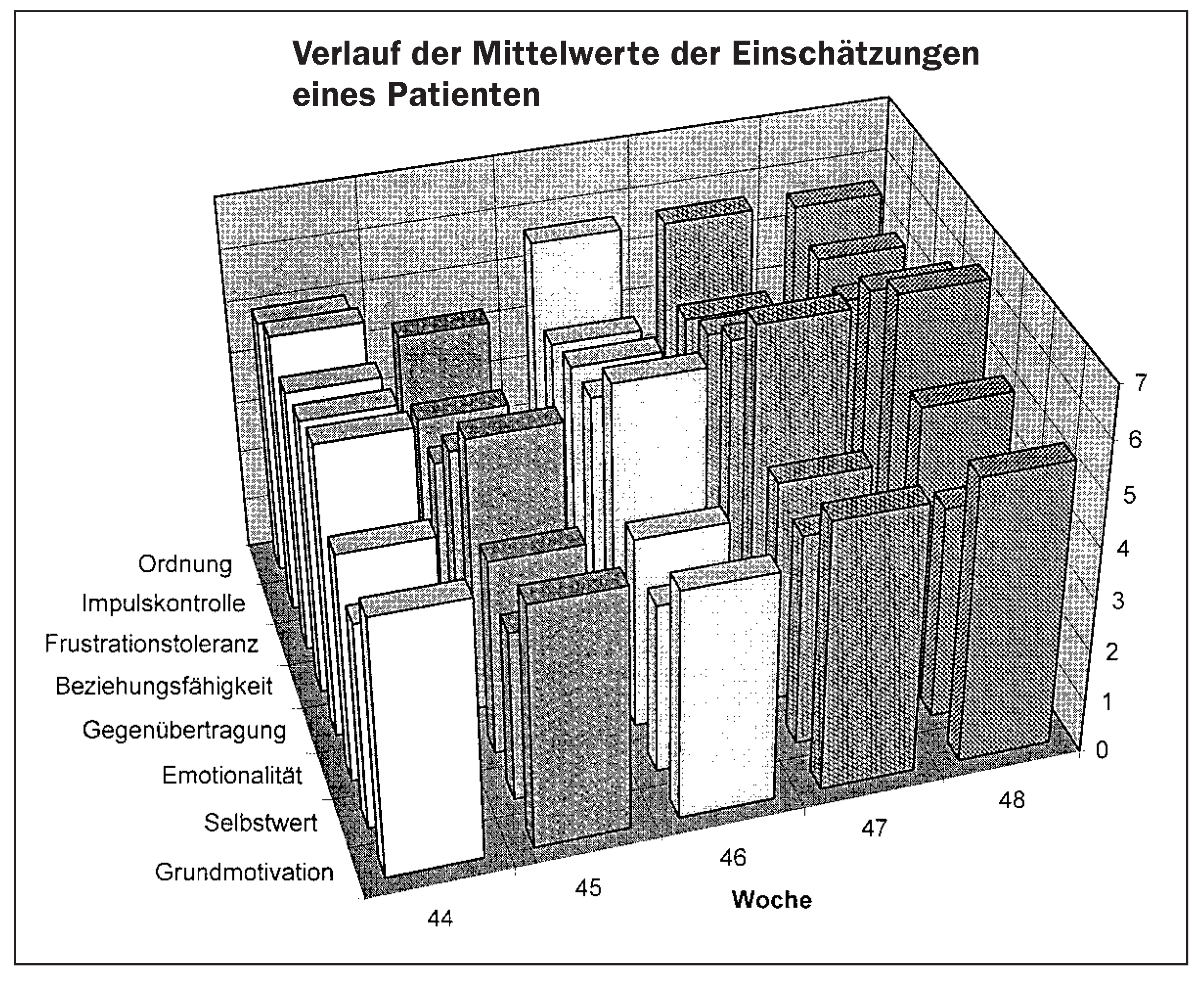 Auffällig ist die sprunghafte Veränderung von Woche 44 zu Woche 45 in Form eines Einbruchs in fast allen Dimensionen, insbesondere der Impulskontrolle. Dies gleicht sich im weiteren Verlauf wieder aus. Klinisch fällt in diese Zeit ein Besuch auf der Herbstmesse, wo eine Mitpatientin aus gegebenem Anlass von einem Missbrauchserlebnis erzählte und damit die Thematik sexueller Übergriffe in der Gruppe der Patienten wieder aktuell wurde. Ursula reagierte darauf mit einem Rückfall in ihre Drogenproblematik und erneuter Suizidalität.