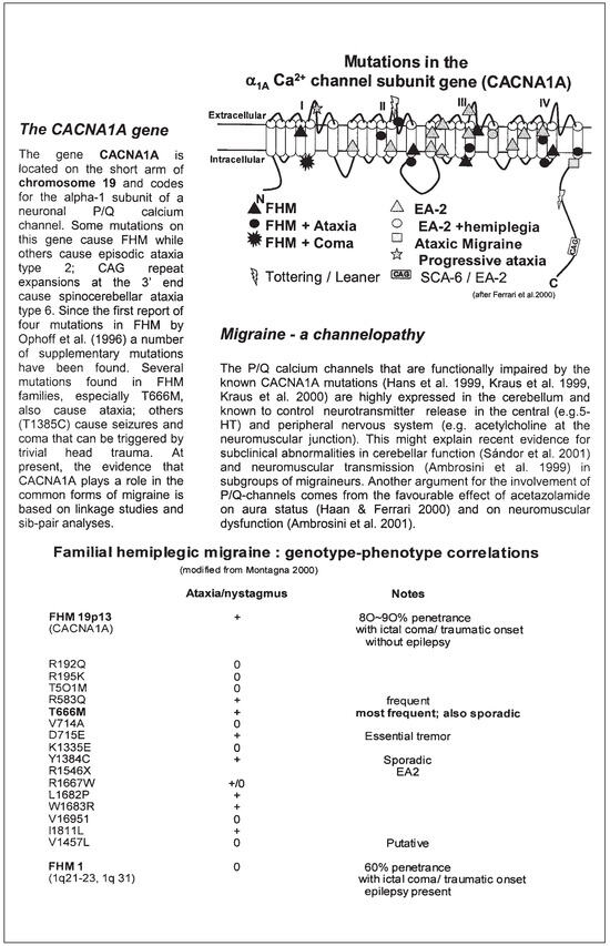 Some important steps forward were achieved in recent years in migraine research. A number of mutations were described in the monogenic subtype of migraine with aura, familial hemiplegic migraine, partly with some clinical overlap to the allelic disorders, episodic ataxia type 2 and spinocerebellar ataxia type 6. Migraine is now considered a neuro-vascular headache disorder and genetic studies point towards migraine in part as a central channelopathy, but also as a complex genetic disorder where genetic and environmental factors are interrelated. There is evidence that certain neurophysiological abnormalities, like deficient cortical information processing and diminished mitochondrial energy reserve, may be interictal endophenotypic markers of the genetic vulnerability to migraine; it remains to be proven that they also are of pathophysiological importance. Other neurophysiological abnormalities, such as subclinical impairment of cerebellar function and of neuromuscular transmission, are unlikely to play a causative role in migraine. If they are due, as suspected, to dysfunctioning neuronal ion channels, they could be useful for the selection of patients for genetic analyses by better defining the phenotype of subgroups of migraineurs. In future studies correlations between neurophysiological and genetic data need to be emphasised. Full article
