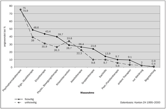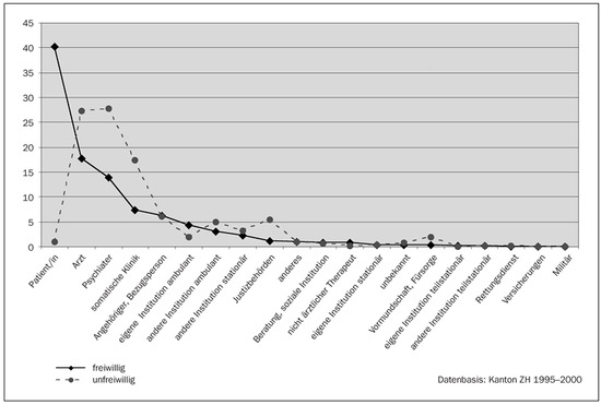 Background: There is a long-term discussion on legitimation and ethical foundation of coercive treatment in psychiatry. Mental health professionals as well as society tolerate coercive measures in a position of double “paternalism”. Medical paternalism favours the hope of fulfilling the assumed real will of a patient by treating the malady that darkens the patient’s will. Social paternalism seeks to protect members of society from perceived though not epidemiologically proven risks stemming from mentally ill persons. Epidemiological data on involuntary hospitalisation has not been available for Switzerland at methodologically sufficient standards. Aims: This paper aims at describing the frequency of involuntary hospitalisation, referral patterns for inpatient treatment, therapeutic measures undertaken and outcome of involuntary patients as compared to voluntary patients. Methods: Involuntary hospitalisation was operationalised as physicians’ ratings of the presumed will of the patient, documented in the database PSYREC of the Swiss canton of Zurich.This database covered all admissions between January 1, 1995 and December 31, 2001 (n = 50 055). It was used to estimate the proportion of involuntary hospitalisations among all psychiatric admissions. A population-based age and sex standardised rate of involuntary hospitalisations per 1000 inhabitants was calculated for the years between 1996 and 2001. Indepth analysis of referral patterns, therapeutic measures and outcome was performed in a subsample of n = 24 607 treatment episodes from January 1, 1998 until December 31, 2000. Results: About 33% of all hospitalisations between 1995 and 1997 were rated as involuntary. For the period between 1998 and 2001 the rate of involuntary hospitalisations had decreased to a lower level of about 28%. The rate of involuntary hospitalisations per 1000 inhabitants rose from 1.57 in 1995 to 1.99 in 2001. The 6-year increase of 27% in the rate of involuntary hospitalisations was considerably smaller than the simultaneous increase of more than 50% for the total hospitalisation rate in the same period. Male and female patients had very similar risks of involuntary hospitalisation. The age profile of voluntary and involuntary patients was similar. Involuntary admissions were more prevalent among patients with diagnoses at admission of mania (F30), delusional disorders (F22) and schizotypal disorders (F21). The great majority of involuntary intakes were initiated by the health care system (general practitioners and psychiatric specialists both >25%, somatic hospitals 17%). Legal authorities were responsible for only 5% of involuntary admissions. The risk of being coercively medicated during the hospital stay was 6-fold for involuntarily admitted patients. Their risk of fixation or isolation was 5.6 times higher.Psychopharmacological medication (either forced or voluntary) is the most prominent therapeutic measure during the hospital stay (for both voluntary and involuntary patients in about 75%). Involuntary patients receive more crisis intervention, but less other therapeutic measures during their stay as compared to voluntary patients. Physicians’ ratings of the outcome of involuntary stays displayed no difference to the outcome of voluntary stays. Discussion:The rate of involuntary treatment is high for the canton of Zurich compared to other European countries.However, hospitalisation rates have increased faster for voluntary patients than involuntary patients, probably due to changing treatment habits in the mental health care system. Outcome of involuntary hospitalisation seems comparable to voluntary hospitalisation despite a lower intensity of measures undertaken, but this result should be validated using more rigorous methodological standards. Full article