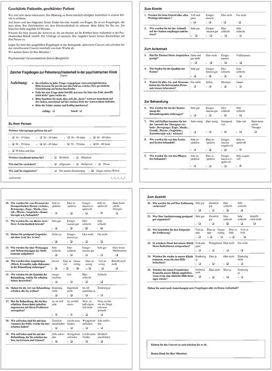 Since the beginning of the 1990s, an increasing attention has been paid to patients’ satisfaction with the care they receive. Personal satisfaction is a part of the measurement of the outcome quality in general. We report on the development and characteristics of a new self-rating questionnaire designed for psychiatric patients to assess the satisfaction with their care. Mentally ill patients have been shown to be well able to give valid estimates in this regard. Relevant areas were defined in four focus groups with psychiatric inpatients, four focus groups with psychiatric staff of different professional background and one focus group with patients’ relatives. The participants’ views were collected, systematically categorised, and questionnaire items were formulated considering the most important categories and participants’ verbatim statements.To assess the dimension of general satisfaction the short uni-dimensional satisfaction questionnaire ZUF-8 has been incorporated; besides, a broad spectrum of different areas of interest were considered. The first version of the questionnaire was tested in two pretests with regard to the acceptance of the questionnaire and its formal criteria. In the 1st pretest, 157 completed questionnaires were obtained from hospitalised patients, in the 2nd pretest, 51 completed questionnaires from patients just leaving the hospital. The questionnaire was both times well accepted, the patients needed about 10 minutes (median) to fill it out and in the 2nd pretest with the slightly adjusted questionnaire no equivocal or not understandable questions were reported. Afterwards, the questionnaire was tested in five psychiatric hospitals of the Canton of Zurich in two investigations. In the 1st investigation, patients were asked immediately before their discharge to complete the Zurich Questionnaire and the Munsterlinger Questionnaire, another approved Swiss self-rating instrument to assess satisfaction with the psychiatric care. In the 2nd investigation, the same patients were asked 10 days after their discharge to fill out the Zurich Questionnaire once again. Results, based on 288 and 110 completed questionnaires respectively, demonstrate that only exceptionally questions were not answered. The answers were generally well distributed, the highest degree of satisfaction having been indicated in less than 50% on average. Practically all items differentiated well or at least in an acceptable way between satisfied and not satisfied patients. In a factor analysis 6 factors were extracted explaining 59% of the variance. Repeating the procedure with the data from the 2nd investigation, the 6-factor solution could be replicated; sufficiently high inner consistence was confirmed for the first factor on which all ZUF-8 items loaded. The Zurich Questionnaire was found to be reliable: Cronbach’s alpha was 0.89 in the first and 0.91 in the 2nd investigation, and comparing the individual scores of both investigations, the 10–14 days test-retest correlation coefficient was 0.74. ZUF-8 items correlated with the remaining items of the questionnaire with r = 0.75 and 0.76 respectively, the scores of Zurich Questionnaire correlated with scores of Munsterlinger Questionnaire with r = 0.71 pointing to an acceptable convergent validity of the questionnaire. Generally, there was a tendency for older, better-insured and voluntary admitted patients to indicate higher ratings and thus higher satisfaction. Comparing the average satisfaction ratings of the 1st and 2nd investigation by the same patients, practically the same results were obtained. Summing up, the Zurich Questionnaire, largely constructed on the basis of the patients’ statements in the focus groups, proved to be well accepted by the patients. The questionnaire also proved to be reliable and valid and can easily be used. Accordingly, it has been approved by the responsible Swiss authorities as a standard instrument to assess satisfaction of the patients with the psychiatric care they received. Full article