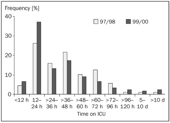 Background: Several forms of stroke units improve outcome after acute ischaemic stroke. In the absence of a ward exclusively for stroke patients (“stroke ward”), intensive monitoring and management of acute stroke patients who fulfilled predefined criteria can well be performed on an intensive care unit (ICU). However, resources on intensive care unit are limited and needed mostly by others than stroke patients.Thus, intensive care unit admission criteria for stroke patients were modified to focus on high-risk patients and possible therapeutic options. Objective: To study the consequences of the modification of intensive care unit admission criteria as quality control. Methods: We performed a standardised observational comparison of clinical characteristics, medication and outcome of ICU-stroke patients prior and after modification of intensive care unit admission criteria between a one-year period in 1997/98 (initial criteria) and in 1999/2000 (modified criteria). Results: In 1999/2000, 121 out of 482 acute stroke patients (25%) were admitted on intensive care unit compared to 88 out of 323 (27%) in 1997/98. The frequency of lacunar syndromes decreased (27 to 6%; p <0.001) whereas that of posterior circulation syndromes increased (11 to 24%; p = 0.03) from 1997/98 to 1999/2000. Median NIH Stroke Scale score was 12 in 1999/2000 and 8 in 1997/98 (p <0.05). Median time on intensive care unit was shorter in 1999/2000 (26 h) than in 1997/98 (40 h; p = 0.06). Thrombolysis was more often (15 versus 4.5%; p <0.02) used in 1999/2000 than in 1997/98. After in-hospital rehabilitation, the rates for “living at home” versus “institutionalised or dead” were 72 versus 28% in 1999/2000 compared to 78.5 versus 21.5% in 1997/98, respectively (p >0.1). Conclusions:The modification of intensive care unit admission criteria was associated with (1) a higher number of ICU-stroke patients who showed a trend to a shorter intensive care unit stay, with (2) increased odds for thrombolysis and with (3) a change in case mix towards more severely affected patients. Despite the latter, the rate of patients living at home after in-hospital rehabilitation remained high. These data may illustrate that efforts to optimise stroke services are feasible and medically important. Full article