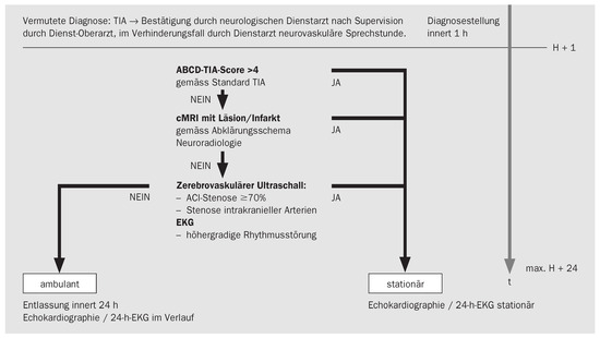 Background and goal: A well structured TIA concept reduces the stroke rate. It is unclear whether this also applies if a general stroke unit concept already exists. Hence we analyzed systematically the effects and the functionality of a newly implemented TIA concept in a Swiss University stroke center with an existing stroke unit concept. Methods: 118 consecutive TIA patients were recruited before (n = 41) and after (n = 77) introduction of the TIA concept. Before the introduction, the TIA patients were treated according to the general stroke unit concept. We carried out a “before-after“ comparison and analysed the following variables: Frequency and timing of diagnostic investigations, distribution of the TIA etiology, and frequency of stroke within 90 days. Patients with “TIA mimics” or “possible TIA” were excluded. Results: Both groups did not differ in baseline characteristics. After implementation of the TIA concept the number of cerebral magnet resonance tomographies (cMRT) increased from 73.2 to 83.1% (p = 0.2) whereas the number of cerebral computer tomographies (cCT) dropped from 82.9 to 71.4% (p = 0.17). Neurosonography was performed more often: 94.8% instead of 90.2% (p = 0.35). The timing of the diagnostic investigations met international requirements. The rate of adherence to the concept with regard to treatment as inpatient versus outpatient increased from 63.4% to 67.5% (p = 0.65). The frequency of undetermined etiologies (TOAST classification) dropped by 8% (p = 0.4) while the rate of cardioembolism and large-artery atherosclerosis increased. The 90-days stroke risk decreased from 9.8% to 3.9% (p = 0.24). Summary: The implementation of a specific TIA concept in addition to an already existent stroke unit concept resulted in moderate improvements with regard to the number of determined etiologies and the use of diagnostic tools. More importantly, a reduction of the stroke rate at 3 months was achieved, possibly by the higher adherence rate to the TIA concept. However these changes have been achieved without any statistical significance due to a small number of patients included. Full article