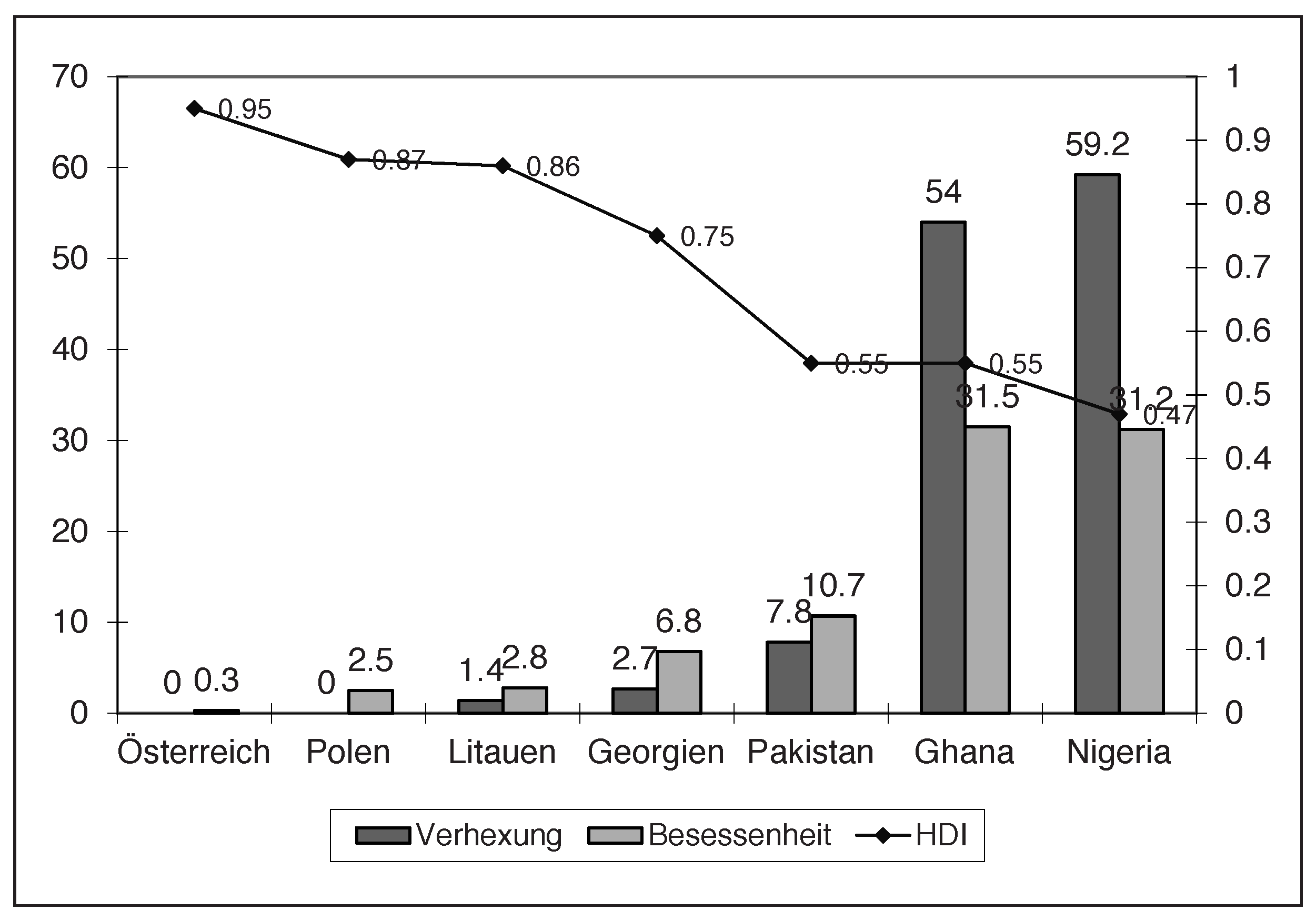 Im Rahmen der International Study on Psychotic Symptoms, einer Kooperation von sieben Staaten (Österreich, Polen, Litauen, Georgien, Pakistan, Nigeria und Ghana) fanden sich in den beiden westafrikanischen Staaten hohe Raten an Besessenheits- und Verhexungsideen. Verhexungsund Besessenheitsideen sind in traditionellen Kulturen äusserst weitverbreitet. Auch in unserem Kollektiv findet sich ein Zusammenhang zwischen dem Modernisierungsgrad (Human Development Index der UN) der an der Studie teilnehmenden Länder und der Häufigkeit dieser Vorstellungen im Wahn (