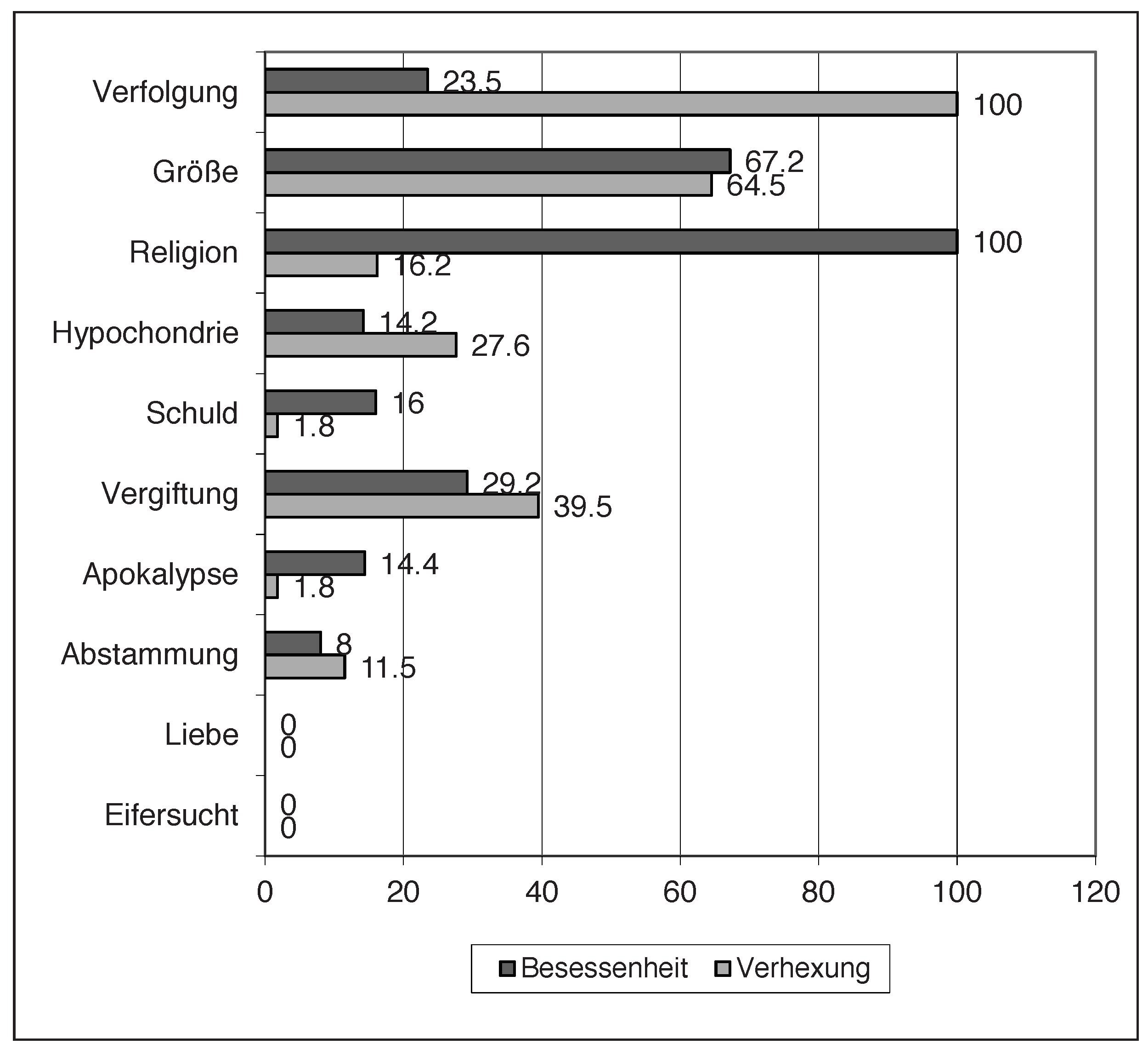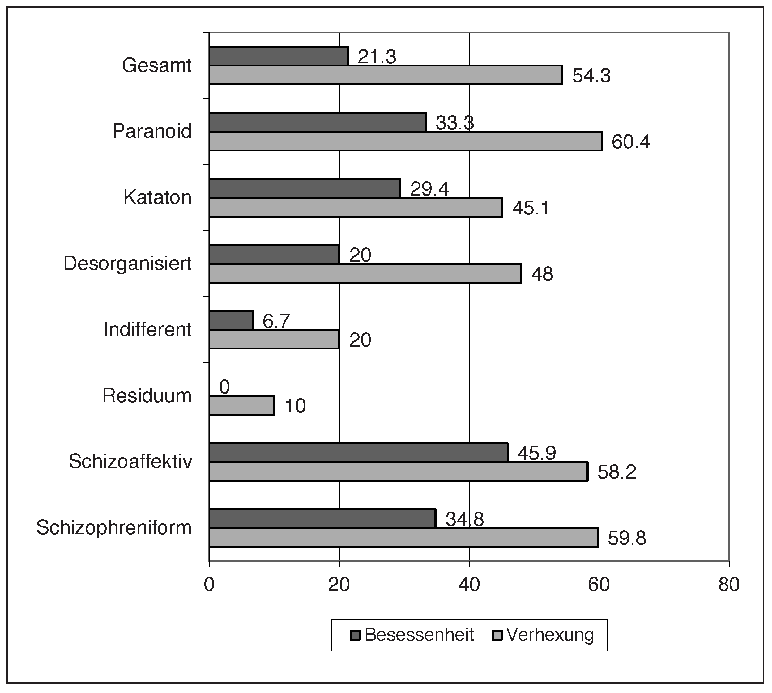 Tab. 2). Diese Vorstellung dient in Gesellschaften mit sehr rigiden weiblichen Geschlechterrollen als soziales und psychisches Ventil. Besessenheit findet sich als Latah in Malaysia oder institutionalisiert als Zar-Kult im Sudan und im arabischen Raum. Auch die Besessenheit durch Mummy Waters, eine nigerianische Wassergöttin, trifft in der Mehrzahl Frauen. Während in unserem Kollektiv Besessenheit in allen Konfessionen gleichmässig vertreten ist, finden sich Verhexungsideen häufiger bei Christen und vor allem bei Anhängern paganer Religionen (