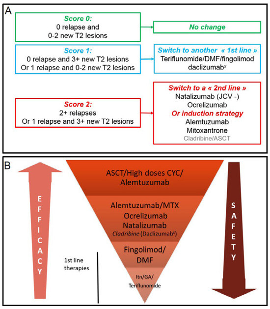 Standard therapy for the majority of multiple sclerosis patients is escalation therapy. Induction therapy may be indicated for severe and active multiple sclerosis. The only two pharmacological agents that can be used for an induction approach are alemtuzumab and mitoxantrone because of their prolonged residual effect. Brain magnetic resonance imaging is a key examination for monitoring patients with relapsing-remitting multiple sclerosis. Full article