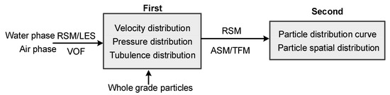 In this paper, the simulation strategy shown in Figure 1 is used to study the flow field characteristics, separation performance, and particle movement behavior of hydrocyclones in two steps [30]. In the first step, the RSM-VOF or LES-VOF is used to simulate the gas–liquid two-phase flow field of the hydrocyclone, focusing on the analysis of the spatial distribution of the AVWZ and its internal flow field characteristics. In the second step, several particle phases are added, and the RSM-TFM or RSM-ASM is used to examine the separation performance of the hydrocyclone and the distribution of particles in the AVWZ with the basis of a stable gas–liquid two-phase flow field.