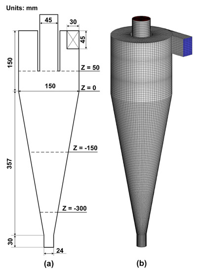 Schematic diagram of laboratory Φ150 mm hydrocyclone. (a) Geometrical parameters; (b) Computational mesh.