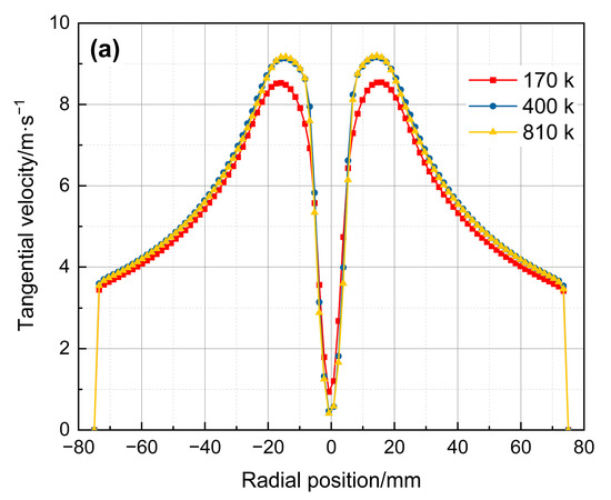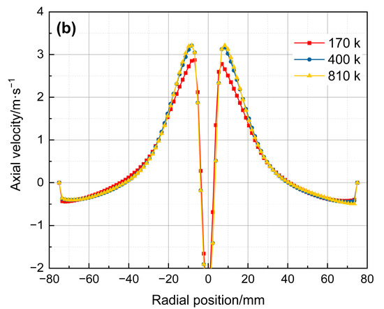 The grid independence check adopts three different grid schemes (170 k, 400 k, and 810 k cells). At the same time, the tangential velocity and the axial velocity at the axial position Z = 0 mm are used as the standard, and the results are show in Figure 3. As can be seen from Figure 2, when the number of cells exceeds 400 k, continuing to reduce the grid size has almost no effect on the calculation results. Therefore, when the RSM-VOF is adopted, the number of cells of the Φ150 mm hydrocyclone is 400 k. When the LES-VOF is adopted and the grid needs to be further refined, the third grid scheme is adopted and the number of cells is 810 k. When the structural parameters of the hydrocyclone change, the meshing method and the value range of Y+ of the wall remain unchanged, and only the meshes whose structure has changed need to be adjusted accordingly.