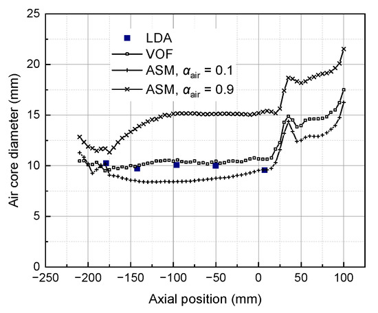 The comparison and verification of the two-phase flow model are based on a Φ75 mm hydrocyclone, and RSM is used to simulate turbulent flow [33]. The VOF model assumes that gas and liquid are incompatible with each other, and the gas–liquid interface can be accurately captured using the Geo-reconstruct format. The ASM assumes that the gas and liquid phases are an interpenetrable continuum, and even without considering the slip velocity between the phases, the dispersed gas–liquid interface can only be captured by the QUICK format. In order to examine the changes in the gas–liquid interface when switching from the VOF model to the ASM, Figure 4 compares the changes in the axial diameter of the air column obtained by VOF, ASM, and LDA. The results show that the air column predicted by the VOF model is basically consistent with the LDA measurement result, and the diameter of the air column is about 10 mm. When the ASM is used, the contour lines when the air volume fraction is 0.1 and 0.9 are taken as the upper and lower limits of the air column boundary. When = 0.1, the diameter of the air column predicted by the ASM is about 15 mm, which is much larger than the measured value of LDA; when αair = 0.9, the diameter of the air column predicted by the ASM is about 9 mm, slightly smaller than the measured value of LDA. On the one hand, this shows that the gas–liquid interface obtained by the ASM is very dispersed; on the other hand, the range of the gas–liquid interface predicted by the ASM includes the LDA measurements, indicating that the model can also accurately simulate the gas–liquid two-phase flow field.