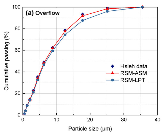 The results in Figure 5 show that the ASM can better predict the particle size composition of the overflow product and the underflow product, but slightly overestimates the content of fine particles in the underflow, while the prediction results of the LPT (Lagrange Particle Tracking) model have a certain deviation from the test results. The reasons for this are largely due to the following two points: (1) The RSM-ASM underestimates the pressure distribution in the hydrocyclone, which leads to an increase in the recovery to underflow and an increase in the content of fine particles; (2) Although the LPT model is based on the ASM, it only acts on the main phase (water), and does not fully consider the influence of other particles on the tracking particles.