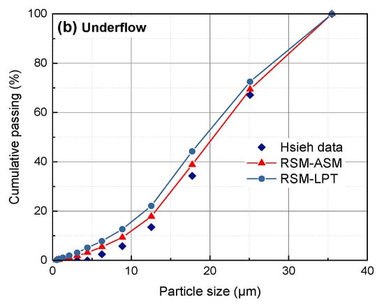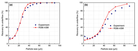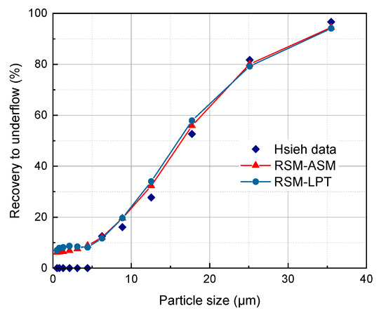 Figure 8 shows that at a lower feed concentration (Cv = 5%), the ASMs can all accurately predict the recovery to underflow and separation size, and the maximum error is less than 8%, but they all overestimate the recovery to underflow of the coarse particle size. When the Cv is 15%, the ASM does not consider the particle friction stress and friction viscosity, resulting in a higher recovery to underflow of coarser particles. This means particle interactions have a greater influence on separation results under the condition of a high concentration feed.