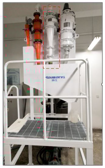 The schematic diagram of the laboratory Φ150 mm hydrocyclone classification system and the experiment device are shown in Figure 7. It can be seen from Figure 7, the laboratory Φ150 mm hydrocyclone classification platform is mainly composed of four parts: the measurement and control system that the different colors of the control system represent start and stop buttons and instruments the feeding system, the classification system, and the sampling system, which is convenient for quickly and accurately adjusting working conditions and obtaining experiment data. Among them, the measurement and control system includes an electromagnetic flowmeter, a pressure sensor, and a control cabinet for displaying measurement data and adjusting the frequency of the motor. During the experiment, the agitaton intensity and the rotational speed of the centrifugal pump can be adjusted through the control cabinet to achieve uniform and stable feeding. The sampling system is composed of a grit chamber, an overflow box, and a bypass pipeline. During the experiment, samples can be taken from the bypass pipe, the lower part of the grit chamber, and the outlet of the overflow box at the same time to ensure the accuracy of the test data.