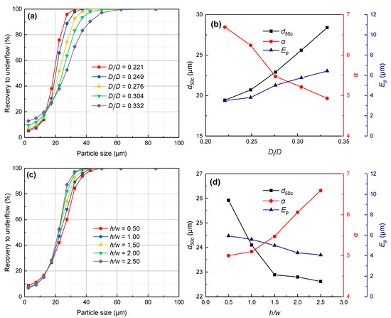 According to the Figure 9a,b, the recovery underflow and the cut size of fine particles gradually increase with the increase in the inlet diameter, while the recovery underflow of coarse particles gradually decreases. Correspondingly, the corrected cut size gradually increases, the Ecart probable Ep gradually increases, and the index α gradually decreases, indicating that the separation accuracy gradually decreases. With the increase in the inlet aspect ratio, the recovery underflow of fine particles decreases slightly, and the recovery underflow of coarse particles increases gradually. Meanwhile, the corrected cut size decreases rapidly and then decreases slowly, the Ep gradually decreases, and the index α also increases gradually, indicating that the separation accuracy is improved.