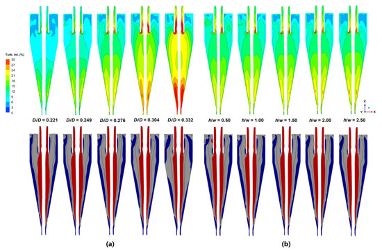 As shown in Figure 11a, with the increase in the inlet diameter, the turbulence intensity of the separation space gradually increases, especially in the lower part of the cone and inside the AVWZ. The spatial distribution range of the AVWZ also gradually expands, and the distribution range of the external swirling flow gradually decreases. As can be seen from Figure 11b, the inlet aspect ratio has little effect on the turbulence intensity and the AVWZ distribution of the entire separation space.