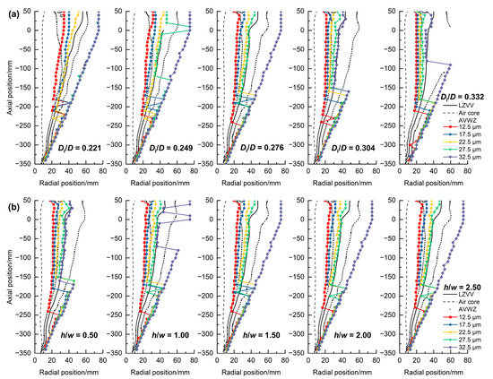 As shown in Figure 13, with the increase in the inlet diameter, the diameter of the air core gradually decreases, and the LZVV gradually moves to the axis, and the water split gradually increases. The inner side of the AVWZ gradually moves toward the axis, and the outer boundary gradually moves toward the wall, and the overall volume increases. The equilibrium gyration radius of medium-sized particles gradually moves closer to the axis due to the decrease in centrifugal strength, and the variation range is larger than that of the inner boundary of the LZVV and AVWZ, resulting in more particles passing through the AVWZ and being discharged with the overflow, and subsequently the yield of sand particles reduces gradually. In addition, the spacing of the equilibrium gyration radius of particles with different strengths gradually decreases, and the separation accuracy gradually decreases. It can be seen from Figure 13b that with the increase in the inlet aspect ratio, the positions of the air column, the LZVV, and the AVWZ are basically unchanged, but the equilibrium gyration radius of medium-sized particles gradually moves closer to the wall. It can be seen that with the increase in the inlet aspect ratio, the centrifugal strength inside the AVWZ will increase, and the centrifugal inertial force on the particles at the same position will be larger. A larger inlet aspect ratio will reduce the distance between the particles in the feed channel and the wall, and medium-to-coarse particles can quickly settle to the wall. When the inlet structure is wider, the feed material will directly enter the AVWZ, resulting in an increase in the cut size and a decrease in the separation accuracy. Therefore, a reasonable feed body should be able to provide pre-separation or a small settling distance, and the turbulence intensity inside the cyclone, especially the axial velocity fluctuation, is low.