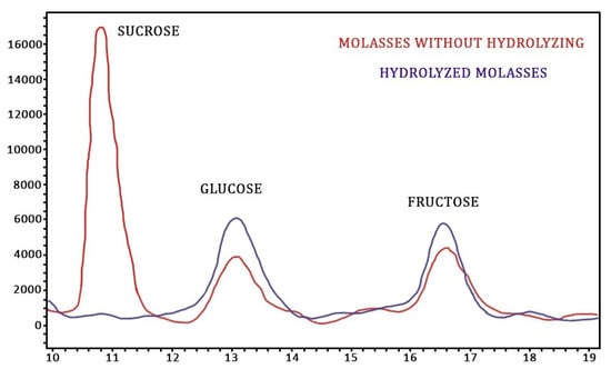 Sugars present in molasses were quantified using the HPLC technique (Agilent 1100 series HPLC, Agilent Tecnologies, Barcelona, Spain). Each sample was centrifuged at 15,000× g and 20 °C for 10 min to remove the suspended solids, and the supernatant was filtered with 0.45 μm nylon filters (Scharlab, S.L., Barcelona, Spain). One gram of supernatant was diluted in 100 mL of distilled water and analyzed with a Bio-Rad AMINEX HPX-87C column, Bio-Rad, Hercules, CA, USA, with the following settings: column temperature: 80 °C, injection volume: 20 μL, refractive index detector: 55 °C, and water as the mobile phase. Reference compounds of sucrose, glucose, and fructose were used (Teknokroma Analytica, S.A., Barcelona, Spain).