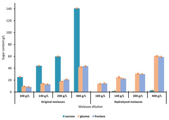 The sugar percentages of the molasses studied were about 3–5% higher than those of other molasses used in previously reported studies [22]. These results could be due to the natural hydrolysis that occurs in molasses stored in warm and slightly acidic environments, such as the geographical area where molasses were obtained for this research. In addition, the chemical composition of molasses is highly variable because it depends on agricultural factors (plant variety, maturity, climate, and soil), the industrial efficiency of sugar production, and the storage time [23].
